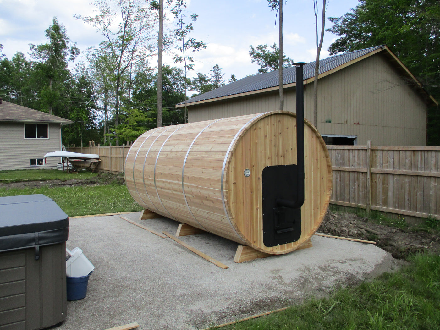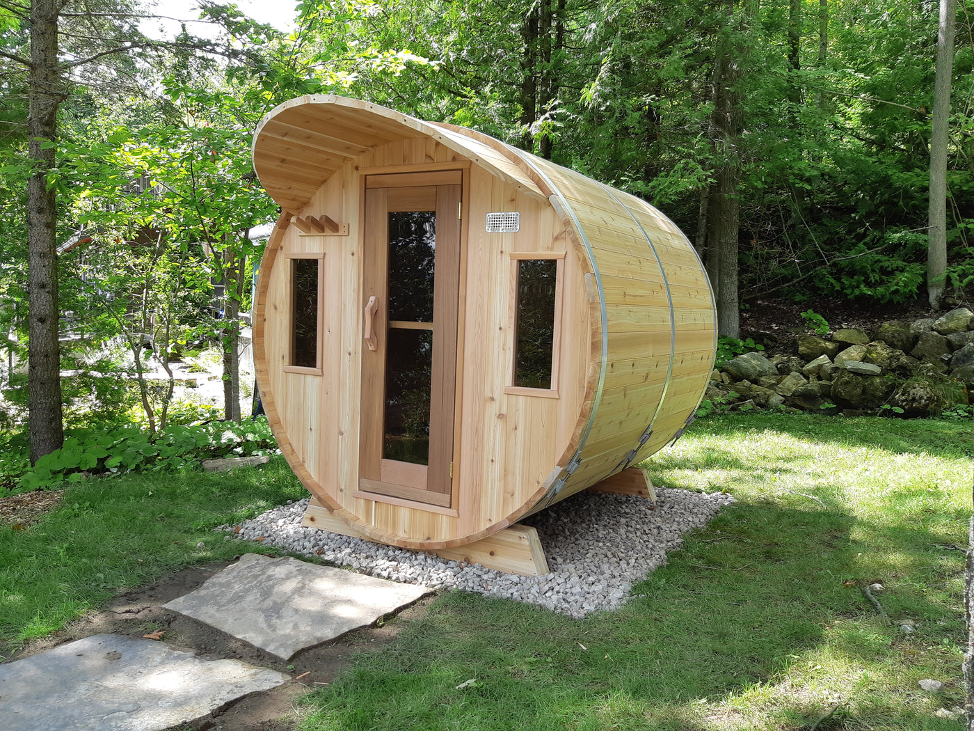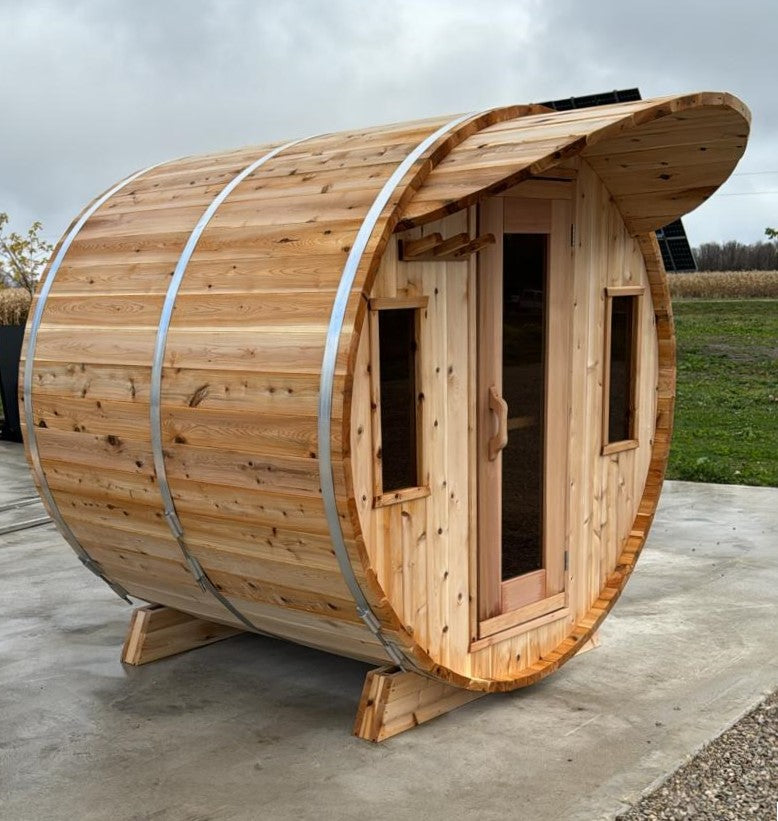 Locally Built in Grey County! These Cedar barrel saunas have 1 3/8″ thick walls for a long natural insulation and the barrel design helps circulate the heat all around. Available in different sizes and various options. Also you can choose from local knotty white cedar or western knotty red cedar. The western red cedar as a stronger cedar scent and also more red in color.