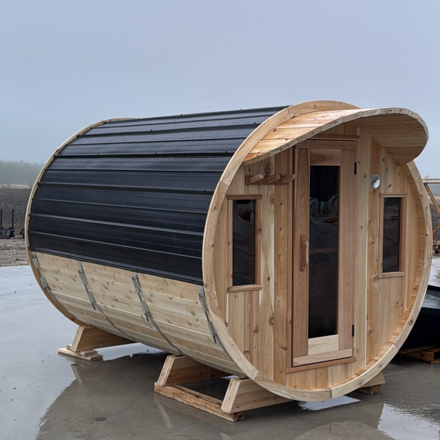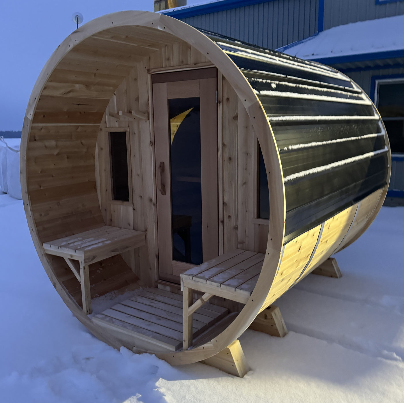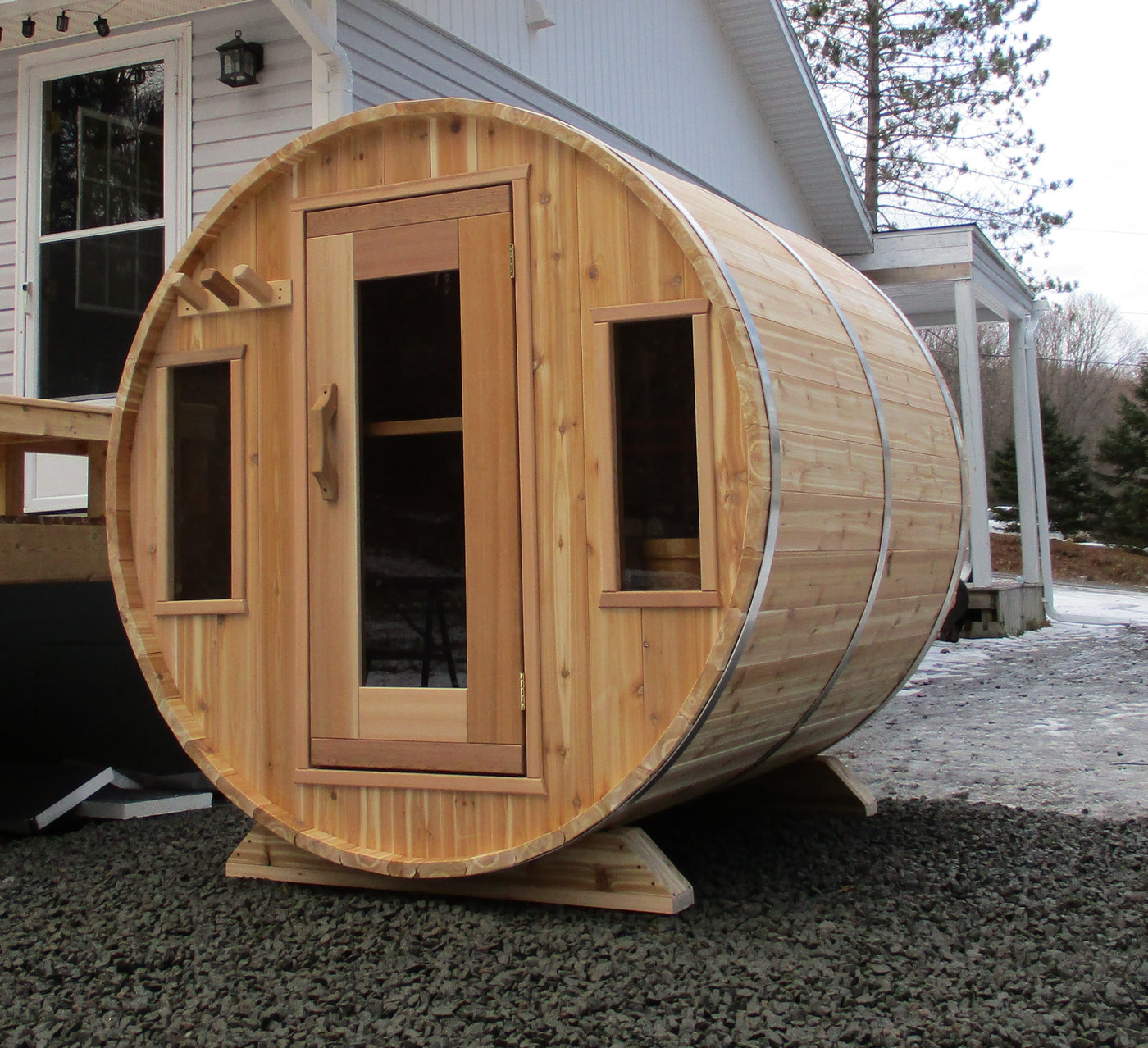 Locally Built in Grey County! These Cedar barrel saunas have 1 3/8″ thick walls for a long natural insulation and the barrel design helps circulate the heat all around. Available in different sizes and various options. Also you can choose from local knotty white cedar or western knotty red cedar. The western red cedar as a stronger cedar scent and also more red in color.