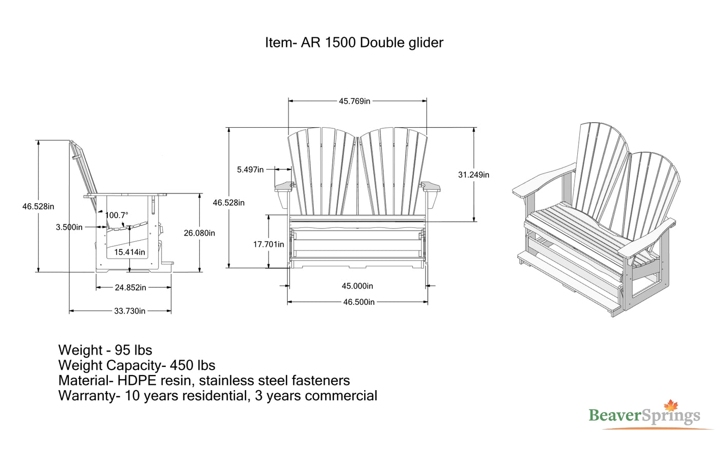 {"id":8804944019612,"title":"#AR-1500 Muskoka Double Glider","handle":"ar-1400-muskoka-single-glider-copy","description":"\u003cp\u003e\u003cspan\u003eEnjoy shared comfort with our Double Muskoka Gliding Chair, crafted from durable, weather-resistant HDPE plastic. Featuring smooth dual gliding motion and classic Muskoka design, it's perfect for relaxing together on patios, porches, or by the lake-with zero maintenance required.\u003c\/span\u003e\u003c\/p\u003e\n\u003cp\u003e\u003cspan\u003e Size - 47\" wide x 34\" D x 47\" H - 95 pounds.\u003c\/span\u003e\u003c\/p\u003e\n\u003cp\u003e \u003c\/p\u003e\n\u003cp\u003e\u003cbr\u003e\u003c\/p\u003e\n\u003ch1\u003e\n\u003cspan style=\"color: #ff2a00;\"\u003e\u003cstrong\u003e\u003c\/strong\u003e\u003c\/span\u003e\u003cbr\u003e\n\u003c\/h1\u003e\n\u003ch2\u003e\u003cbr\u003e\u003c\/h2\u003e","published_at":"2026-02-07T10:30:47-05:00","created_at":"2026-02-07T10:25:10-05:00","vendor":"vendor-unknown","type":"Furniture","tags":["Outdoor Recycled Plastic Chairs \u0026 Furniture"],"price":76900,"price_min":76900,"price_max":76900,"available":true,"price_varies":false,"compare_at_price":null,"compare_at_price_min":0,"compare_at_price_max":0,"compare_at_price_varies":false,"variants":[{"id":46170412384412,"title":"Red","option1":"Red","option2":null,"option3":null,"sku":null,"requires_shipping":true,"taxable":true,"featured_image":null,"available":true,"name":"#AR-1500 Muskoka Double Glider - Red","public_title":"Red","options":["Red"],"price":76900,"weight":0,"compare_at_price":null,"inventory_management":"shopify","barcode":null,"requires_selling_plan":false,"selling_plan_allocations":[]},{"id":46170412417180,"title":"Yellow","option1":"Yellow","option2":null,"option3":null,"sku":null,"requires_shipping":true,"taxable":true,"featured_image":null,"available":true,"name":"#AR-1500 Muskoka Double Glider - Yellow","public_title":"Yellow","options":["Yellow"],"price":76900,"weight":0,"compare_at_price":null,"inventory_management":"shopify","barcode":null,"requires_selling_plan":false,"selling_plan_allocations":[]},{"id":46170412449948,"title":"Lime","option1":"Lime","option2":null,"option3":null,"sku":null,"requires_shipping":true,"taxable":true,"featured_image":null,"available":true,"name":"#AR-1500 Muskoka Double Glider - Lime","public_title":"Lime","options":["Lime"],"price":76900,"weight":0,"compare_at_price":null,"inventory_management":"shopify","barcode":null,"requires_selling_plan":false,"selling_plan_allocations":[]},{"id":46170412482716,"title":"Forest Green","option1":"Forest Green","option2":null,"option3":null,"sku":null,"requires_shipping":true,"taxable":true,"featured_image":null,"available":true,"name":"#AR-1500 Muskoka Double Glider - Forest Green","public_title":"Forest Green","options":["Forest Green"],"price":76900,"weight":0,"compare_at_price":null,"inventory_management":"shopify","barcode":null,"requires_selling_plan":false,"selling_plan_allocations":[]},{"id":46170412515484,"title":"Sky Blue","option1":"Sky Blue","option2":null,"option3":null,"sku":null,"requires_shipping":true,"taxable":true,"featured_image":null,"available":true,"name":"#AR-1500 Muskoka Double Glider - Sky Blue","public_title":"Sky Blue","options":["Sky Blue"],"price":76900,"weight":0,"compare_at_price":null,"inventory_management":"shopify","barcode":null,"requires_selling_plan":false,"selling_plan_allocations":[]},{"id":46170412548252,"title":"Cobalt Blue","option1":"Cobalt Blue","option2":null,"option3":null,"sku":null,"requires_shipping":true,"taxable":true,"featured_image":null,"available":true,"name":"#AR-1500 Muskoka Double Glider - Cobalt Blue","public_title":"Cobalt Blue","options":["Cobalt Blue"],"price":76900,"weight":0,"compare_at_price":null,"inventory_management":"shopify","barcode":null,"requires_selling_plan":false,"selling_plan_allocations":[]},{"id":46170412581020,"title":"Black","option1":"Black","option2":null,"option3":null,"sku":null,"requires_shipping":true,"taxable":true,"featured_image":null,"available":true,"name":"#AR-1500 Muskoka Double Glider - Black","public_title":"Black","options":["Black"],"price":76900,"weight":0,"compare_at_price":null,"inventory_management":"shopify","barcode":null,"requires_selling_plan":false,"selling_plan_allocations":[]},{"id":46170412613788,"title":"White","option1":"White","option2":null,"option3":null,"sku":null,"requires_shipping":true,"taxable":true,"featured_image":null,"available":true,"name":"#AR-1500 Muskoka Double Glider - White","public_title":"White","options":["White"],"price":76900,"weight":0,"compare_at_price":null,"inventory_management":"shopify","barcode":null,"requires_selling_plan":false,"selling_plan_allocations":[]},{"id":46170412646556,"title":"Charcoal","option1":"Charcoal","option2":null,"option3":null,"sku":null,"requires_shipping":true,"taxable":true,"featured_image":null,"available":true,"name":"#AR-1500 Muskoka Double Glider - Charcoal","public_title":"Charcoal","options":["Charcoal"],"price":76900,"weight":0,"compare_at_price":null,"inventory_management":"shopify","barcode":null,"requires_selling_plan":false,"selling_plan_allocations":[]},{"id":46170412679324,"title":"Tan","option1":"Tan","option2":null,"option3":null,"sku":null,"requires_shipping":true,"taxable":true,"featured_image":null,"available":true,"name":"#AR-1500 Muskoka Double Glider - Tan","public_title":"Tan","options":["Tan"],"price":76900,"weight":0,"compare_at_price":null,"inventory_management":"shopify","barcode":null,"requires_selling_plan":false,"selling_plan_allocations":[]},{"id":46170412712092,"title":"Chocolate","option1":"Chocolate","option2":null,"option3":null,"sku":null,"requires_shipping":true,"taxable":true,"featured_image":null,"available":true,"name":"#AR-1500 Muskoka Double Glider - Chocolate","public_title":"Chocolate","options":["Chocolate"],"price":76900,"weight":0,"compare_at_price":null,"inventory_management":"shopify","barcode":null,"requires_selling_plan":false,"selling_plan_allocations":[
