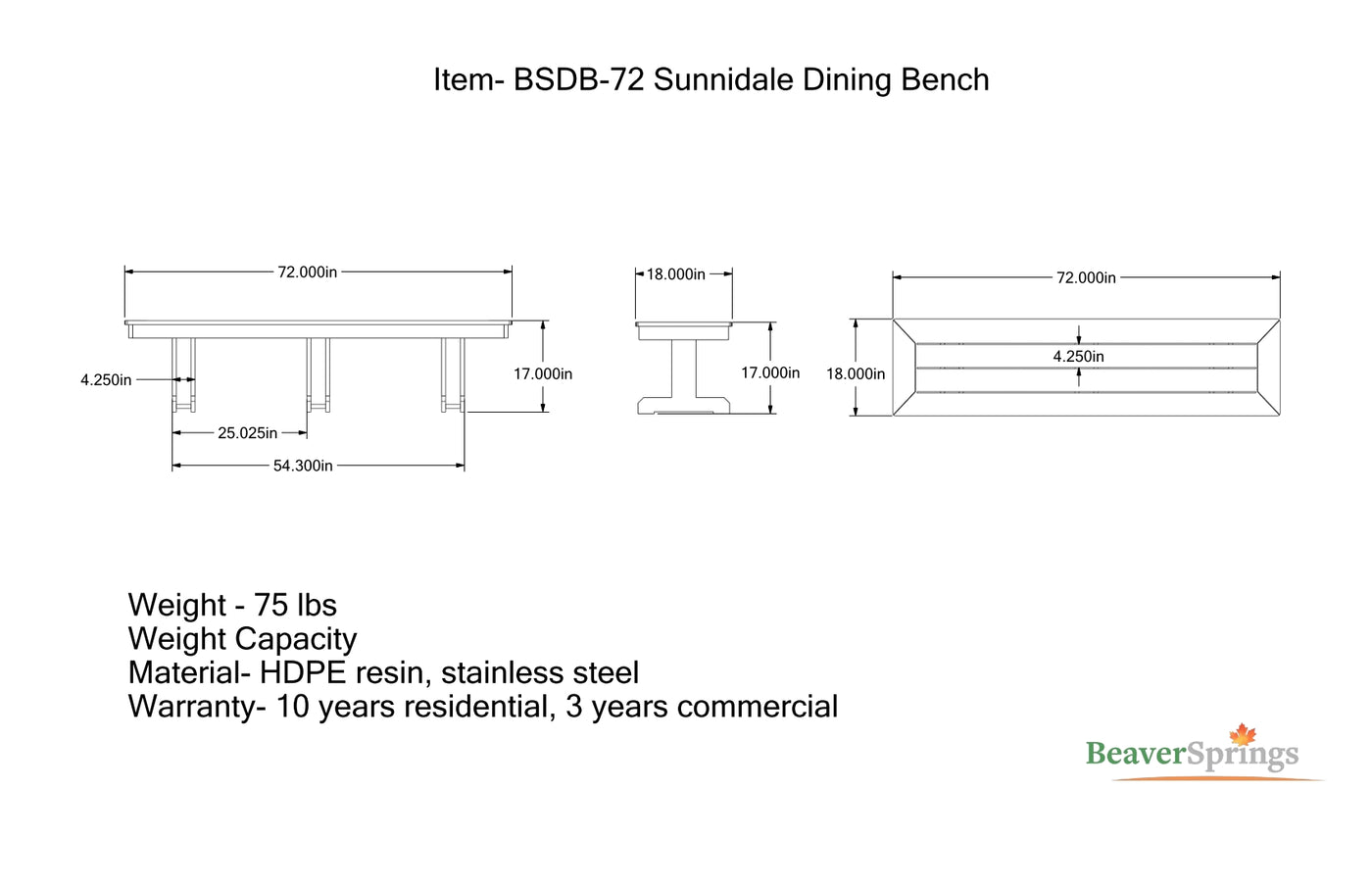{"id":8486397313180,"title":"#BSDB-72 Sunnidale Dining Bench","handle":"bsdb-72-sunnidale-dining-bench","description":"\u003cp\u003e\u003cspan\u003eAdd a Heavy duty solidly build Sunnidale Dining bench to your set for extra seating, maintenance free HDPE plastic build for years of outdoor service.\u003c\/span\u003e\u003c\/p\u003e\n\u003cp\u003e\u003cspan\u003eSize: 72\" L x 18\" W x 17\" H - 75 lbs.\u003c\/span\u003e\u003c\/p\u003e\n\u003ch5\u003e\u003cspan\u003e\u003cstrong\u003eMade in Ontario Canada By:\u003c\/strong\u003e\u003c\/span\u003e\u003c\/h5\u003e\n\u003cp\u003e\u003cspan\u003e\u003cstrong\u003e\u003cimg src=\"https:\/\/cdn.shopify.com\/s\/files\/1\/0318\/5914\/6889\/files\/BeaverSprings_logo_blue_0953a0ad-7d85-45a0-9c9f-891492f19d5d.jpg?v=1754679413\" alt=\"\" width=\"201\" height=\"56\"\u003e\u003c\/strong\u003e\u003c\/span\u003e\u003c\/p\u003e\n\u003cp\u003e \u003c\/p\u003e","published_at":"2025-08-09T15:28:07-04:00","created_at":"2025-08-09T15:24:18-04:00","vendor":"vendor-unknown","type":"Furniture","tags":["Outdoor Recycled Plastic Chairs \u0026 Furniture"],"price":57900,"price_min":57900,"price_max":57900,"available":true,"price_varies":false,"compare_at_price":null,"compare_at_price_min":0,"compare_at_price_max":0,"compare_at_price_varies":false,"variants":[{"id":45186576547996,"title":"Red","option1":"Red","option2":null,"option3":null,"sku":null,"requires_shipping":true,"taxable":true,"featured_image":null,"available":true,"name":"#BSDB-72 Sunnidale Dining Bench - Red","public_title":"Red","options":["Red"],"price":57900,"weight":0,"compare_at_price":null,"inventory_management":"shopify","barcode":null,"requires_selling_plan":false,"selling_plan_allocations":[]},{"id":45186576580764,"title":"Yellow","option1":"Yellow","option2":null,"option3":null,"sku":null,"requires_shipping":true,"taxable":true,"featured_image":null,"available":true,"name":"#BSDB-72 Sunnidale Dining Bench - Yellow","public_title":"Yellow","options":["Yellow"],"price":57900,"weight":0,"compare_at_price":null,"inventory_management":"shopify","barcode":null,"requires_selling_plan":false,"selling_plan_allocations":[]},{"id":45186576613532,"title":"Lime","option1":"Lime","option2":null,"option3":null,"sku":null,"requires_shipping":true,"taxable":true,"featured_image":null,"available":true,"name":"#BSDB-72 Sunnidale Dining Bench - Lime","public_title":"Lime","options":["Lime"],"price":57900,"weight":0,"compare_at_price":null,"inventory_management":"shopify","barcode":null,"requires_selling_plan":false,"selling_plan_allocations":[]},{"id":45186576646300,"title":"Forest Green","option1":"Forest Green","option2":null,"option3":null,"sku":null,"requires_shipping":true,"taxable":true,"featured_image":null,"available":true,"name":"#BSDB-72 Sunnidale Dining Bench - Forest Green","public_title":"Forest Green","options":["Forest Green"],"price":57900,"weight":0,"compare_at_price":null,"inventory_management":"shopify","barcode":null,"requires_selling_plan":false,"selling_plan_allocations":[]},{"id":45186576679068,"title":"Sky Blue","option1":"Sky Blue","option2":null,"option3":null,"sku":null,"requires_shipping":true,"taxable":true,"featured_image":null,"available":true,"name":"#BSDB-72 Sunnidale Dining Bench - Sky Blue","public_title":"Sky Blue","options":["Sky Blue"],"price":57900,"weight":0,"compare_at_price":null,"inventory_management":"shopify","barcode":null,"requires_selling_plan":false,"selling_plan_allocations":[]},{"id":45186576711836,"title":"Colbalt Blue","option1":"Colbalt Blue","option2":null,"option3":null,"sku":null,"requires_shipping":true,"taxable":true,"featured_image":null,"available":true,"name":"#BSDB-72 Sunnidale Dining Bench - Colbalt Blue","public_title":"Colbalt Blue","options":["Colbalt Blue"],"price":57900,"weight":0,"compare_at_price":null,"inventory_management":"shopify","barcode":null,"requires_selling_plan":false,"selling_plan_allocations":[]},{"id":45186576744604,"title":"Black","option1":"Black","option2":null,"option3":null,"sku":null,"requires_shipping":true,"taxable":true,"featured_image":null,"available":true,"name":"#BSDB-72 Sunnidale Dining Bench - Black","public_title":"Black","options":["Black"],"price":57900,"weight":0,"compare_at_price":null,"inventory_management":"shopify","barcode":null,"requires_selling_plan":false,"selling_plan_allocations":[]},{"id":45186576777372,"title":"White","option1":"White","option2":null,"option3":null,"sku":null,"requires_shipping":true,"taxable":true,"featured_image":null,"available":true,"name":"#BSDB-72 Sunnidale Dining Bench - White","public_title":"White","options":["White"],"price":57900,"weight":0,"compare_at_price":null,"inventory_management":"shopify","barcode":null,"requires_selling_plan":false,"selling_plan_allocations":[]},{"id":45186576810140,"title":"Charcoal","option1":"Charcoal","option2":null,"option3":null,"sku":null,"requires_shipping":true,"taxable":true,"featured_image":null,"available":true,"name":"#BSDB-72 Sunnidale Dining Bench - Charcoal","public_title":"Charcoal","options":["Charcoal"],"price":57900,"weight":0,"compare_at_price":null,"inventory_management":"shopify","barcode":null,"requires_selling_plan":false,"selling_plan_allocations":[]},{"id":45186576842908,"title":"Tan","option1":"Tan","option2":null,"option3":null,"sku":null,"requires_shipping":true,"taxable":true,"featured_image":null,"available":true,"name":"#BSDB-72 Sunnidale Dining Bench - Tan","public_title":"Tan","options":["Tan"],"price":57900,"weight":0,"compare_at_price":null,"inventory_management":"shopify","barcode":null,"requires_selling_plan":false,"selling_plan_allocations":[]},{"id":45186576875676,"title":"Chocolate","option1":"Chocolate","option2":null,"option3":null,"sku":null,"requires_shipping":true,"taxable":true,"featured_image":null,"available":true,"name":"#BSDB-72 Sunnidale Dining Bench - Chocolate","public_title":"Chocolate","options":["Chocolate"],"price":57900,"weight":0,"compare_at_price":null,"inventory_management":"shopify","ba
