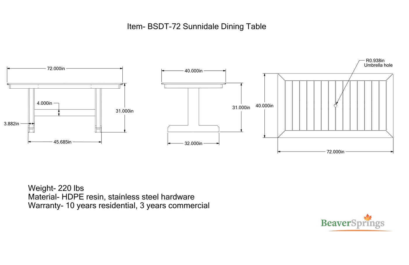 {"id":8486397509788,"title":"#BSDT-72 Sunnidale Dining Table 72\"","handle":"bsdb-72-sunnidale-dining-bench-copy","description":"\u003cp\u003e\u003cspan\u003eHeavy duty solidly build Sunnidale Dining table, maintenance free HDPE plastic build for years of outdoor service.\u003c\/span\u003e\u003c\/p\u003e\n\u003cp\u003e\u003cspan\u003eSize: 72\" L x 40\" W x 31\" H - 220 lbs.\u003c\/span\u003e\u003c\/p\u003e\n\u003ch5\u003e\u003cspan\u003e\u003cstrong\u003eMade in Ontario Canada By:\u003c\/strong\u003e\u003c\/span\u003e\u003c\/h5\u003e\n\u003cp\u003e\u003cspan\u003e\u003cstrong\u003e\u003cimg height=\"56\" width=\"201\" alt=\"\" src=\"https:\/\/cdn.shopify.com\/s\/files\/1\/0318\/5914\/6889\/files\/BeaverSprings_logo_blue_0953a0ad-7d85-45a0-9c9f-891492f19d5d.jpg?v=1754679413\"\u003e\u003c\/strong\u003e\u003c\/span\u003e\u003c\/p\u003e\n\u003cp\u003e \u003c\/p\u003e","published_at":"2025-08-09T15:33:09-04:00","created_at":"2025-08-09T15:28:43-04:00","vendor":"vendor-unknown","type":"Furniture","tags":["Outdoor Recycled Plastic Chairs \u0026 Furniture"],"price":124900,"price_min":124900,"price_max":124900,"available":true,"price_varies":false,"compare_at_price":null,"compare_at_price_min":0,"compare_at_price_max":0,"compare_at_price_varies":false,"variants":[{"id":45186577105052,"title":"Red","option1":"Red","option2":null,"option3":null,"sku":null,"requires_shipping":true,"taxable":true,"featured_image":null,"available":true,"name":"#BSDT-72 Sunnidale Dining Table 72\" - Red","public_title":"Red","options":["Red"],"price":124900,"weight":0,"compare_at_price":null,"inventory_management":"shopify","barcode":null,"requires_selling_plan":false,"selling_plan_allocations":[]},{"id":45186577137820,"title":"Yellow","option1":"Yellow","option2":null,"option3":null,"sku":null,"requires_shipping":true,"taxable":true,"featured_image":null,"available":true,"name":"#BSDT-72 Sunnidale Dining Table 72\" - Yellow","public_title":"Yellow","options":["Yellow"],"price":124900,"weight":0,"compare_at_price":null,"inventory_management":"shopify","barcode":null,"requires_selling_plan":false,"selling_plan_allocations":[]},{"id":45186577170588,"title":"Lime","option1":"Lime","option2":null,"option3":null,"sku":null,"requires_shipping":true,"taxable":true,"featured_image":null,"available":true,"name":"#BSDT-72 Sunnidale Dining Table 72\" - Lime","public_title":"Lime","options":["Lime"],"price":124900,"weight":0,"compare_at_price":null,"inventory_management":"shopify","barcode":null,"requires_selling_plan":false,"selling_plan_allocations":[]},{"id":45186577203356,"title":"Forest Green","option1":"Forest Green","option2":null,"option3":null,"sku":null,"requires_shipping":true,"taxable":true,"featured_image":null,"available":true,"name":"#BSDT-72 Sunnidale Dining Table 72\" - Forest Green","public_title":"Forest Green","options":["Forest Green"],"price":124900,"weight":0,"compare_at_price":null,"inventory_management":"shopify","barcode":null,"requires_selling_plan":false,"selling_plan_allocations":[]},{"id":45186577236124,"title":"Sky Blue","option1":"Sky Blue","option2":null,"option3":null,"sku":null,"requires_shipping":true,"taxable":true,"featured_image":null,"available":true,"name":"#BSDT-72 Sunnidale Dining Table 72\" - Sky Blue","public_title":"Sky Blue","options":["Sky Blue"],"price":124900,"weight":0,"compare_at_price":null,"inventory_management":"shopify","barcode":null,"requires_selling_plan":false,"selling_plan_allocations":[]},{"id":45186577268892,"title":"Colbalt Blue","option1":"Colbalt Blue","option2":null,"option3":null,"sku":null,"requires_shipping":true,"taxable":true,"featured_image":null,"available":true,"name":"#BSDT-72 Sunnidale Dining Table 72\" - Colbalt Blue","public_title":"Colbalt Blue","options":["Colbalt Blue"],"price":124900,"weight":0,"compare_at_price":null,"inventory_management":"shopify","barcode":null,"requires_selling_plan":false,"selling_plan_allocations":[]},{"id":45186577301660,"title":"Black","option1":"Black","option2":null,"option3":null,"sku":null,"requires_shipping":true,"taxable":true,"featured_image":null,"available":true,"name":"#BSDT-72 Sunnidale Dining Table 72\" - Black","public_title":"Black","options":["Black"],"price":124900,"weight":0,"compare_at_price":null,"inventory_management":"shopify","barcode":null,"requires_selling_plan":false,"selling_plan_allocations":[]},{"id":45186577334428,"title":"White","option1":"White","option2":null,"option3":null,"sku":null,"requires_shipping":true,"taxable":true,"featured_image":null,"available":true,"name":"#BSDT-72 Sunnidale Dining Table 72\" - White","public_title":"White","options":["White"],"price":124900,"weight":0,"compare_at_price":null,"inventory_management":"shopify","barcode":null,"requires_selling_plan":false,"selling_plan_allocations":[]},{"id":45186577367196,"title":"Charcoal","option1":"Charcoal","option2":null,"option3":null,"sku":null,"requires_shipping":true,"taxable":true,"featured_image":null,"available":true,"name":"#BSDT-72 Sunnidale Dining Table 72\" - Charcoal","public_title":"Charcoal","options":["Charcoal"],"price":124900,"weight":0,"compare_at_price":null,"inventory_management":"shopify","barcode":null,"requires_selling_plan":false,"selling_plan_allocations":[]},{"id":45186577399964,"title":"Tan","option1":"Tan","option2":null,"option3":null,"sku":null,"requires_shipping":true,"taxable":true,"featured_image":null,"available":true,"name":"#BSDT-72 Sunnidale Dining Table 72\" - Tan","public_title":"Tan","options":["Tan"],"price":124900,"weight":0,"compare_at_price":null,"inventory_management":"shopify","barcode":null,"requires_selling_plan":false,"selling_plan_allocations":[]},{"id":45186577432732,"title":"Chocolate","option1":"Chocolate","option2":null,"option3":null,"sku":null,"requires_shipping":true,"taxable":true,"featured_image":null,"available":true,"name":"#BSDT-72 Sunnidale Dining Table 72\" - Chocolate","public_title":"Chocolate","options":["Chocolate"],"price":124900,"weight":0,"compare_at_pric