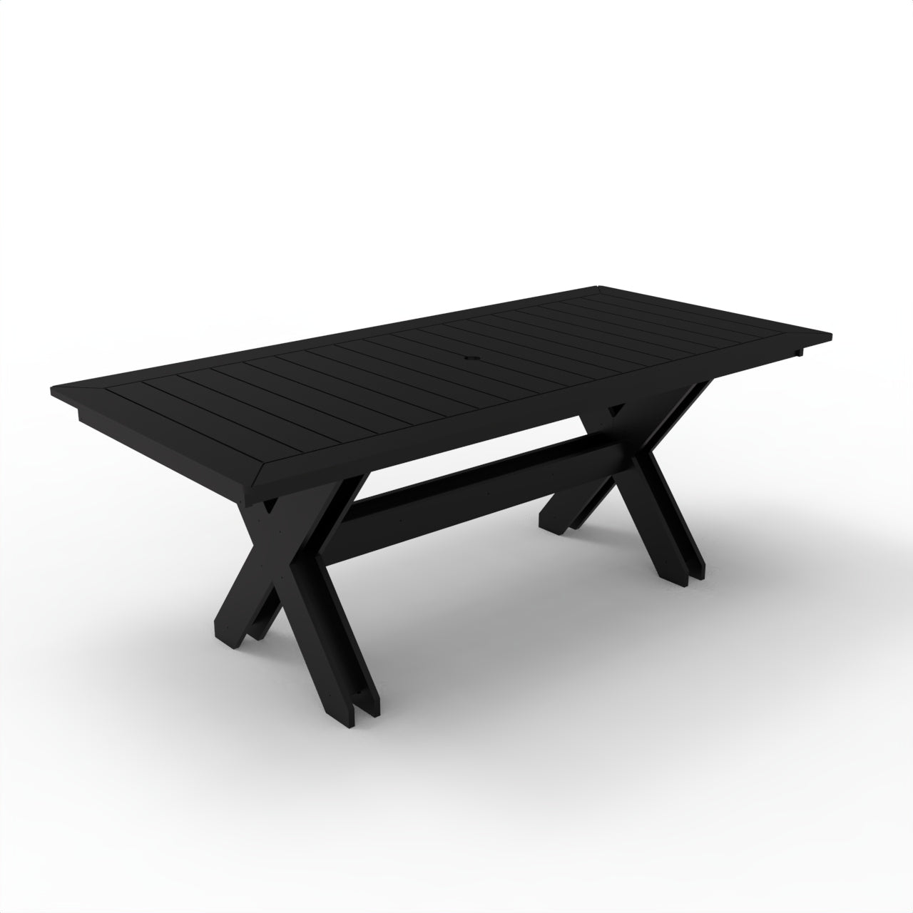 X dining table features rugged 3/4" solid plastic construction with additional stainless steel supports underneath. Seats 6 - 8 people. Comes w/umbrella hole. Inquire for custom sizes. 84" L x 36" W x 31.5" H